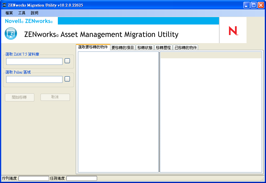 登入 Novell® ZENworks® 10 Asset Management 移轉公用程式後,會顯示移轉主控台。