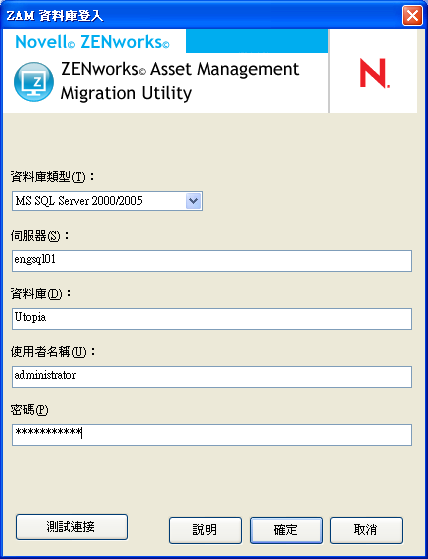 移轉來源為 ZENworks Asset Management 7.5 資料庫。移轉公用程式要求您登入移轉來源時具備建立、修改與刪除權限。若要登入您的資料庫︰