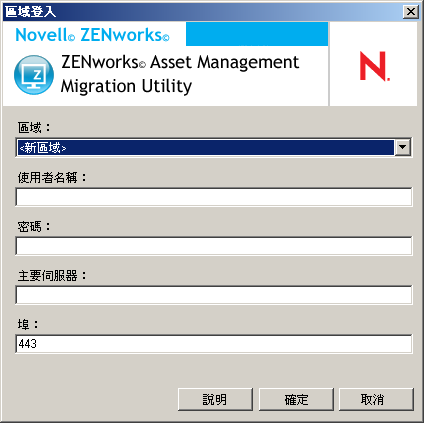 若要登入做為移轉來源的 ZENworks 10 Asset Management 的管理區域: