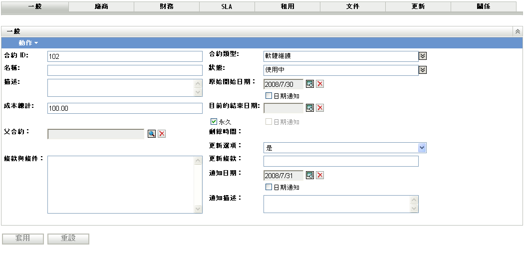一般︰ 為合約新增基本資訊。除修改在建立合約時提供的資訊之外,您還可以為開始日期、結束日期和通知日期設定電子郵件通知。如需指示,請參閱節 24.0, 使用日期通知。