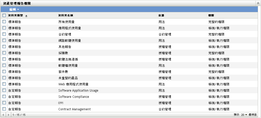 ︰賦予管理員建立、編輯、移動以及刪除報告的完整權限。對於標準報告,此設定與相同,因為您無法變更標準報告。