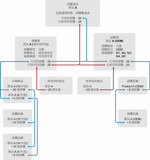 在本例中,產品 A (探查到的產品) 與兩份授權書都關聯。其中五個安裝 (在 M1、M2、M3、M4 與 M5 上) 使用產品 A OEM 授權書中的授權。其他 20 個安裝使用產品 A 基於使用者的授權書中的授權。