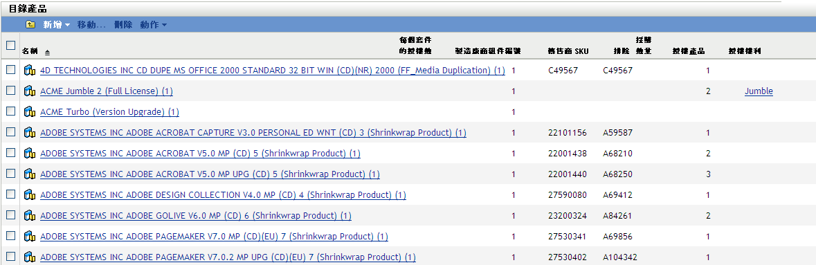 「目錄產品」面板會顯示每個目錄產品的「採購數量」,即已採購之目錄產品的套數 (根據採購記錄)。該面板還會顯示「授權數量」,即採購的套件中包含的授權總數。