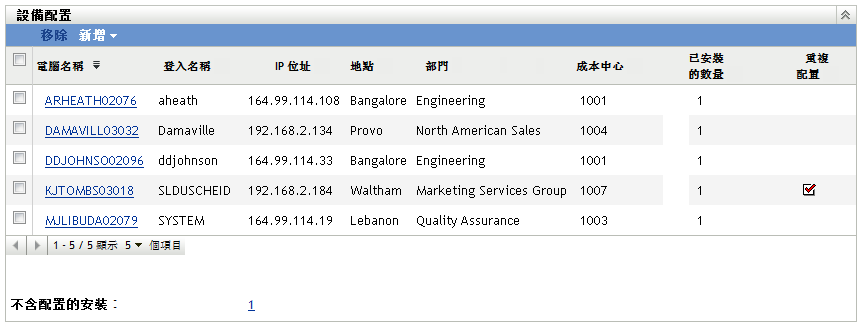 重複配置︰ 如果設備的安裝也包含於使用者組配置,則會顯示一個核取記號。