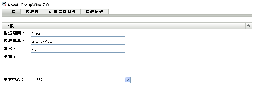 成本中心︰ 這是新增的自定欄位,供舉例之用。預先定義的一般資訊中不包含此欄位。您可以視需要新增任意數量的自定欄位。如需更多資訊,請參閱節 6.7, 將自定欄位新增至授權產品。