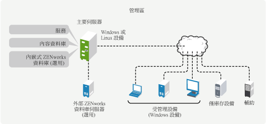 一個管理區域由至少一個主要伺服器、輔助設備 (如有需要)、一或多個受管理設備或僅庫存設備組成。主要伺服器與輔助設備會互相協作來管理設備。管理區的資訊會存放在其中一部主要伺服器的資料庫中,或儲存在其他未安裝 ZENworks 的外部伺服器上。