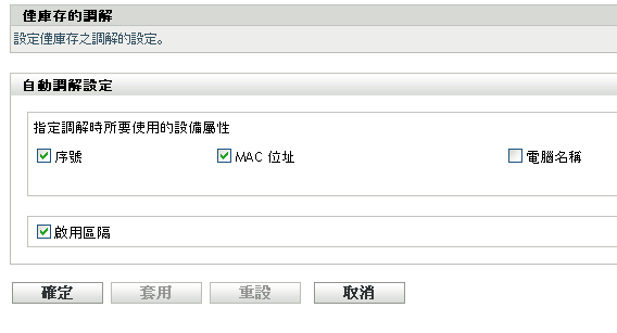 「僅庫存的調解」可讓您控制是否要調解新工作站,以及新工作站的調解方式,以避免資料庫中出現重複項目。對管理區中的新工作站執行掃描時,會指定識別碼給工作站。識別碼若是遺失 (如磁碟毀損所致),則會在下次掃描時指定新的識別碼。重整可讓您檢查工作站是否已位於資料庫中。若是,則會變更資料庫的識別碼,使之符合新的識別碼。