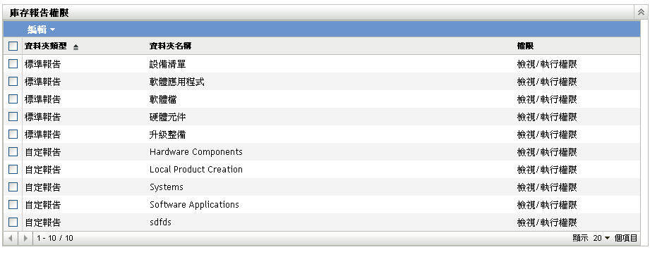 「庫存報告權限」可讓您管理每一位管理員對各資料夾及其報告的權限。每一個報告資料夾皆具備此資料夾相關聯的權限,以管理資料夾內的所有報告。例如,若有完整權限,即可編輯報告;但若只有檢視/執行權限時,便只可查看與執行報告。如有庫存報告權限,則可對可以存取及編輯特定報告的人員進行限制。報告資料夾類型 (自定或標準) 及報告名稱會與資料夾的相關權限一起列出。選項包括: