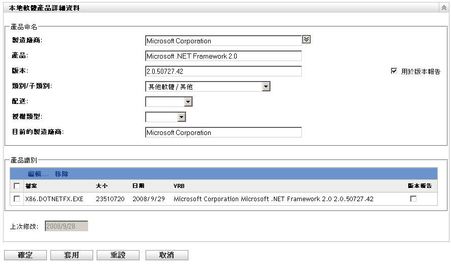 「本地軟體產品詳細資料」頁面顯示有關本地軟體產品及用以識別產品的檔案之詳細資料。您可從此編輯產品資訊或「版本識別區塊」(Version Recognition Block, VRB) 資料以識別檔案。若是與產品相關的檔案未包含版本資源區塊 (VRB) 資訊,這些欄位會顯示「未命名」。
