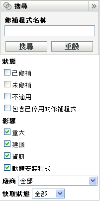 「修補程式」頁中的區段提供了大量的搜尋和資料過濾選項,可讓您依據修補程式的狀態和影響搜尋特定的修補程式並過濾結果集。搜尋與篩選可分開執行,也可以結合起來使用以提供更為強大的功能。下圖顯示區段︰