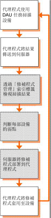 ZENworks 伺服器中每天都會啟動修補偵測週期,該服務會針對所有 ZENworks 受管理設備 (伺服器和工作站) 排程「探查適用更新」(DAU) 任務。