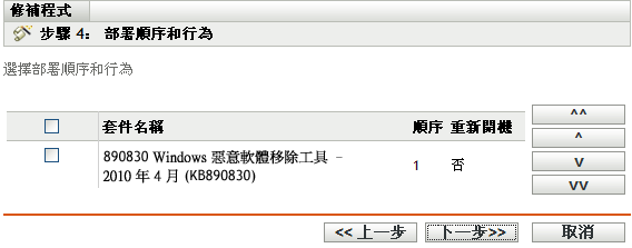 「部署修復精靈」的「部署順序和行為」頁可讓您設定每個部署排程的順序與行為。為選定修補程式排程部署的第四步是為其設定部署的順序和行為。