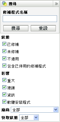 「修補程式」頁中的區段提供了大量的搜尋和資料過濾選項,可讓您依據修補程式的狀態和影響搜尋特定的修補程式並過濾結果集。搜尋與篩選可分開執行,也可以結合起來使用以提供更為強大的功能。下圖顯示區段: