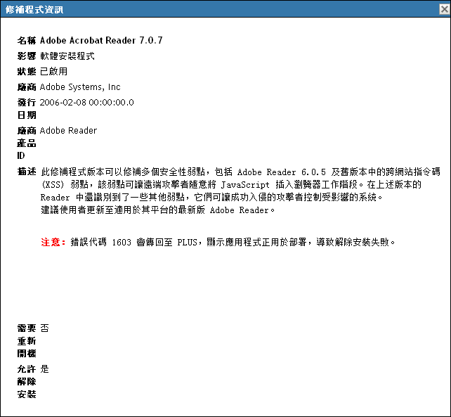 下圖所示為修補程式名稱範例,其中「Adobe」為廠商,「Acrobat Reader」為應用程式,「6.0.6」為版本資訊: