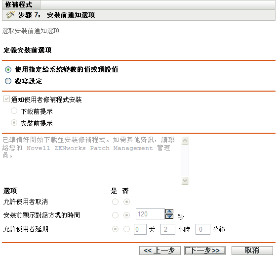 「部署矯正精靈」的「安裝前通知選項」頁可讓您定義下載與安裝修補程式時,使用者是否會收到通知,並可讓您自定通知內容。為選定修補程式排程部署的第七步是設定通知與允許使用者取消選項。