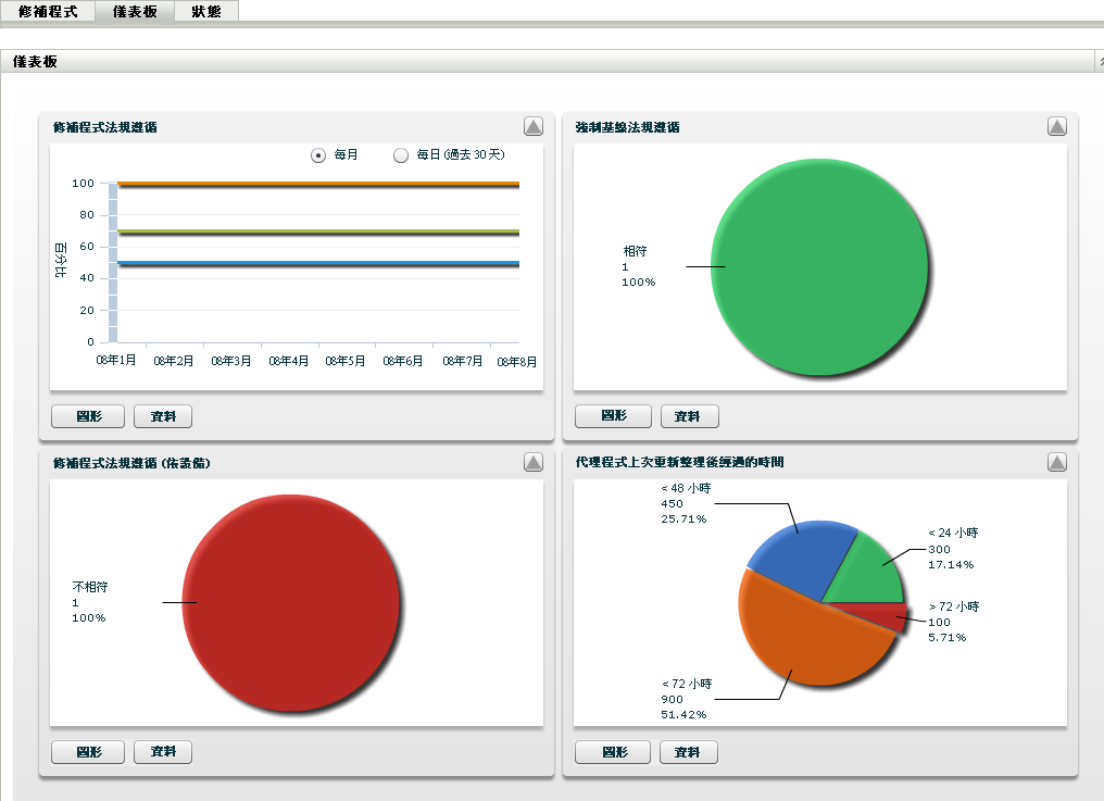 儀表板地址操作、管理及法規遵循報告需要使用圖形儀表板,及針對個別機器或彙總層級記錄修補程式、修補程式部署、修補狀態、趨勢、庫存等資訊的 4 份標準報告。所提供的整合式檢視窗可說明內部與外部稽核的進度及法規遵循要求。您可以在索引標籤的功能表中按一下,以更新儀表板。