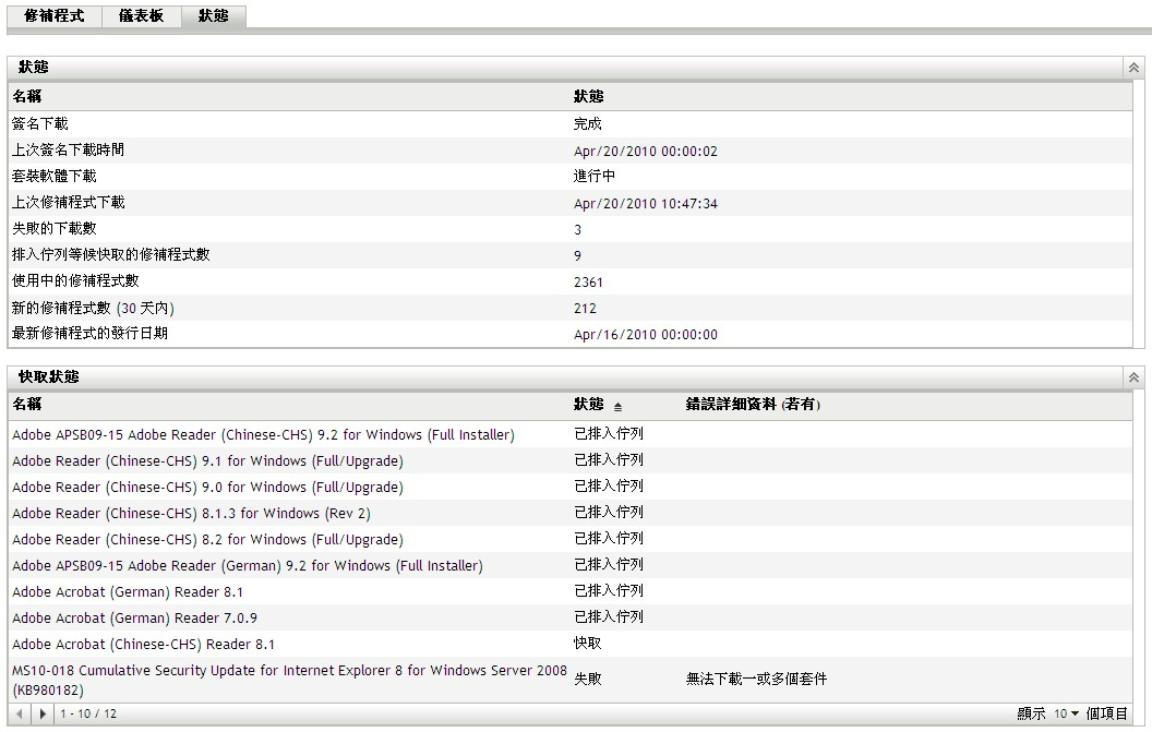 「狀態」頁由系統狀態與快取狀態組成,顯示修補程式的整體資訊。如需詳細資訊,請參閱