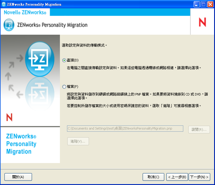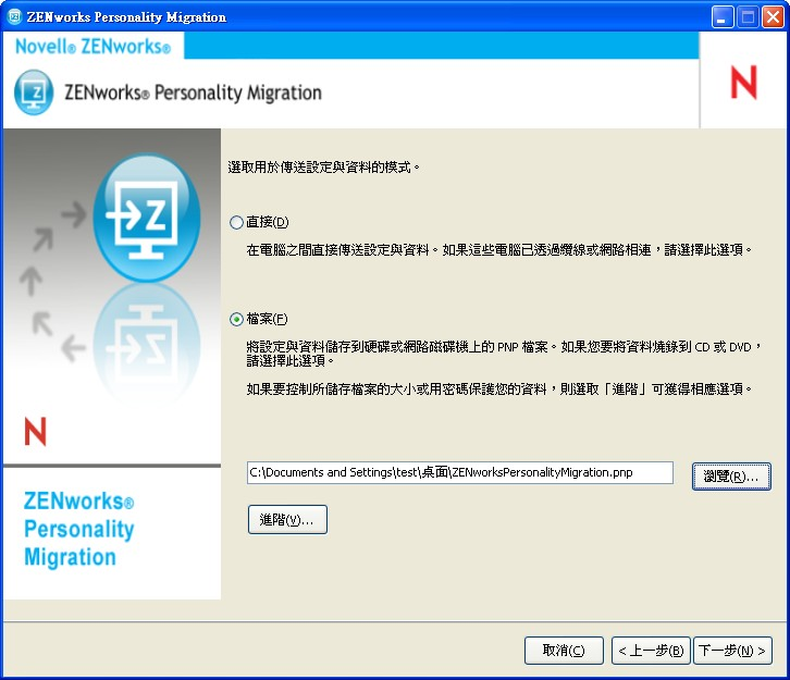 檔案: 將移轉設定與資料儲存在 PNP 檔案中。指定檔名,或按一下瀏覽至儲存設定與資料的檔案並加以選取。