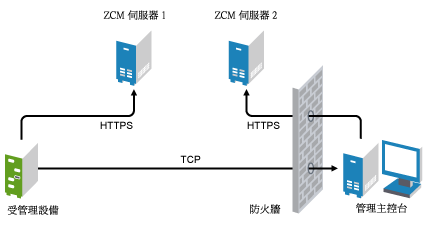 這種情況下,遠端工作階段將由管理主控台上的管理員啟動。管理主控台通常位於企業網路內部,而受管理設備可位於該企業網路內部或者外部。下圖說明了從管理主控台啟動受管理設備上的遠端工作階段。