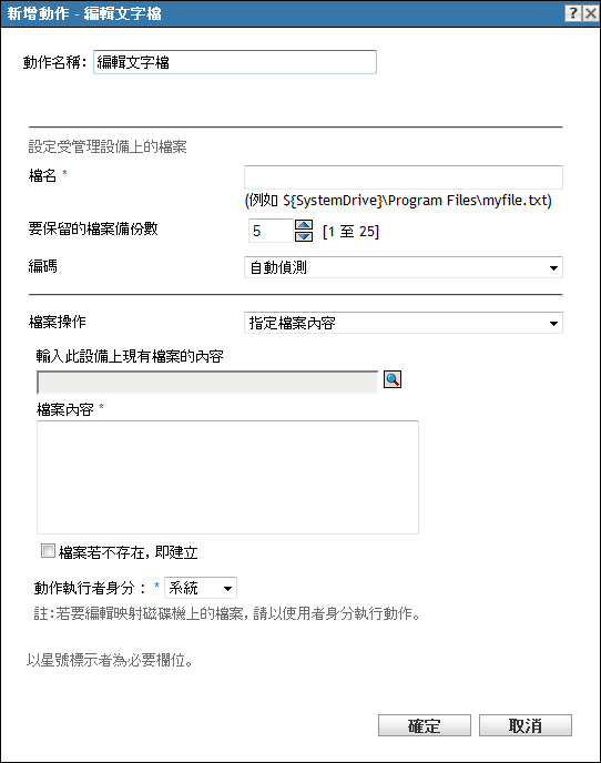 「動作 - 編輯文字檔」對話方塊可讓您指定檔案,並設定要對檔案執行之變更的清單。