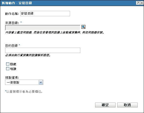 「動作 - 安裝目錄」對話方塊可讓您指定所要安裝的目錄;指定目的路徑;指定目錄複製到設備上之後,應予以隱藏或設為唯讀;以及指定複製選項。您也可以使用此頁面安裝「Novell 檔案上載」延伸功能,以瀏覽目錄。