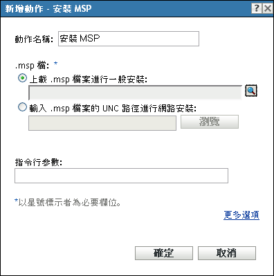 「動作 - 安裝 MSP」對話方塊可讓您指定 MSP 檔案的位置,指令行參數,以及可執行檔的安全性層級。