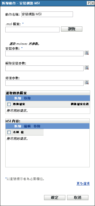 「動作 - 安裝網路 MSI」對話方塊可讓您指定 MSI 檔案的位置,其安裝、解除安裝及修復參數,轉換檔案,以及可執行檔的安全性層級。