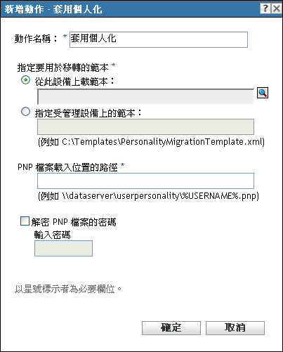 PNP 檔案載入位置的路徑 指定受管理設備上包含移轉設定與資料之 PNP 檔案的路徑。您也可以指定檔案的 UNC 路徑。