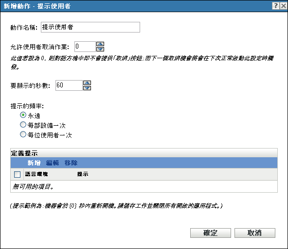 允許使用者取消作業: 指定使用者是否可取消動作集中的其他動作。例如,若動作集所安裝的應用程式需要重新開機,並且您選取了此選項,則使用者可以取消重新開機,進而取消安裝作業。安裝動作集會根據其排程再次執行。因此,請謹慎使用此選項。若您使用預設設定 0,對話方塊上將不會有按鈕。