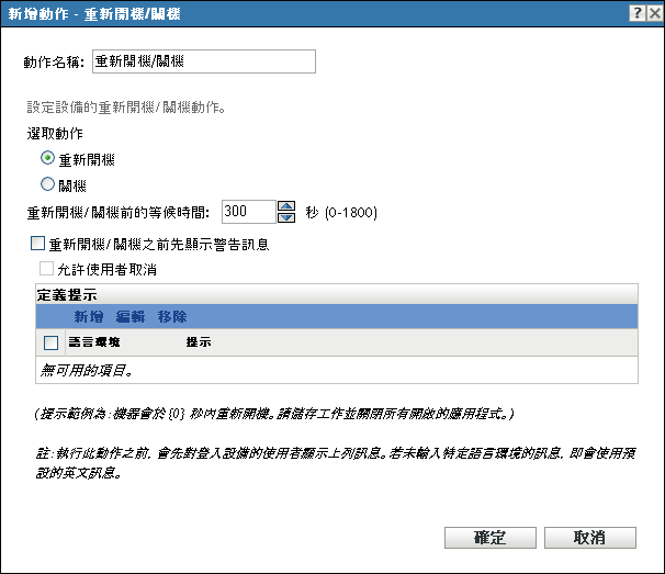 重新開機/關機前的等候時間: 指定重新啟動或關閉設備前的秒數 (介於 -1 至 1800 之間)。經過指定的秒數後,無論使用者是否按,設備皆會重新啟動或關閉。按並不會使設備立即重新啟動或關閉。