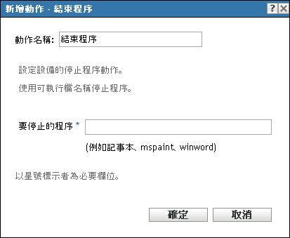 「動作 - 結束程序」對話方塊可讓您指定要停止之程序 (如 notepad、mspaint、winword 等) 的可執行檔名稱。程序若未在設備上執行,表示「結束程序」任務完成。