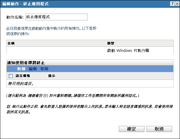「動作 - 終止應用程式」對話方塊可讓您復原在啟動動作集中執行的所有操作。您也可以設定提示以通知使用者即將終止。