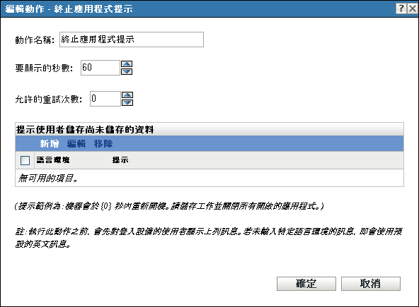 「動作 - 終止應用程式提示」對話方塊可讓您設定在應用程式終止前通知使用者的提示,包括通知使用者的秒數、提示重試的次數、以及不同地區設定的不同訊息。