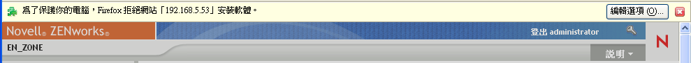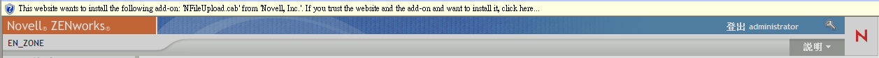 根據網頁瀏覽器安全性設定的不同,您可能會收到訊息,指出瀏覽器不讓您安裝「Novell 檔案上載」延伸功能。