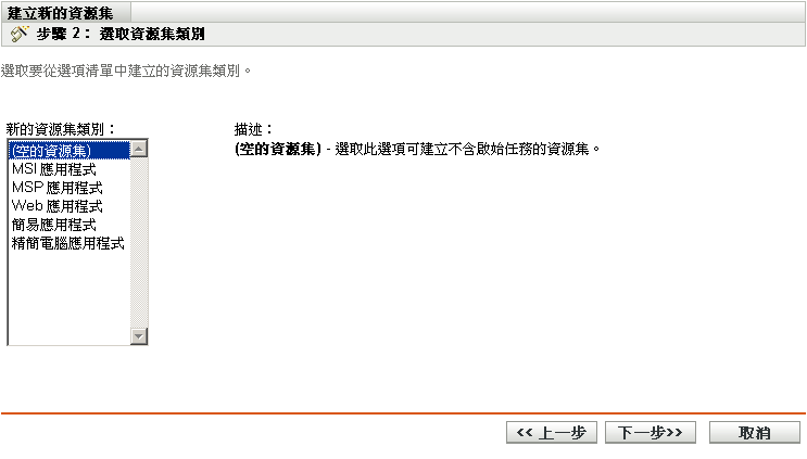 空的套裝軟體: 不具備啟始任務的套裝軟體。此套裝軟體類別可協助您快速建立套裝軟體,而無需執行「建立新套裝軟體精靈」中的所有任務。建立空的套裝軟體之後,可在日後編輯其詳細資料,以新增指定、動作等。