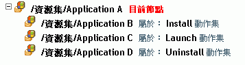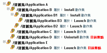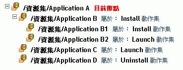 此外,某一套裝軟體可以同時為主要套裝軟體與相依套裝軟體,如下圖所示。應用程式 A 為主要套裝軟體,應用程式 B、B1、B2、C 與 D 為相依套裝軟體。