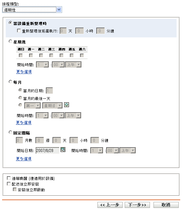 附註:以下各節將說明所有週期性排程選項。依據排程的事件或動作,某些選項可能無法使用。