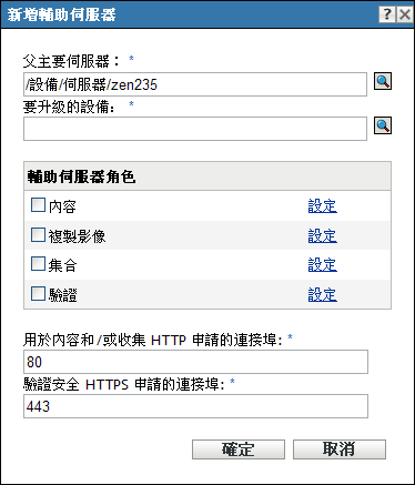 若連結對某一角色停用,則表示該角色對於此設備停用。例如,若輔助設備的父主要伺服器不具備收集角色,則輔助設備的收集角色將會停用,且無法對其進行設定。受管理設備所執行的不可設定的角色也將會在對話方塊中列出,只是無法進行編輯。