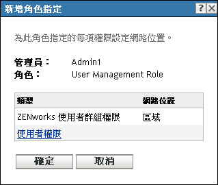「新增角色指定」對話方塊顯示後,您便可以為角色中包含的角色類型定義網路位置。網路位置可讓您限制所授予之權限的使用位置。例如,可以將管理員的「快速任務權限」角色指定為限制於 ZENworks 控制中心內的「設備」資料夾。