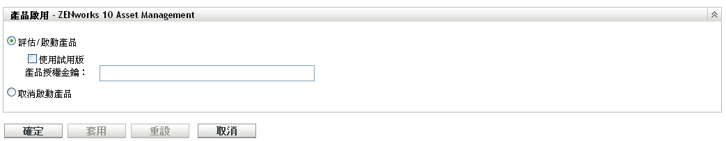 在「產品啟用」面板中,選取「評估/啟動產品」選項。