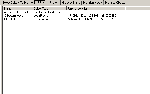 「要移轉的項目」標籤顯示各選定物件的名稱、物件類型和唯一識別碼。在物件上按一下滑鼠右鍵,然後選取