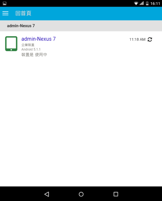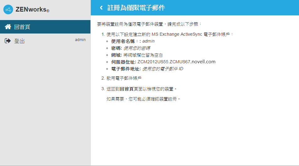 附註:設定 ActiveSync 帳戶後,如果裝置無法自動重整為 ZENworks 代理程式 APP 註冊後所建立的裝置物件,且指定的裝置註冊規則中核取了允許使用者手動重整,則系統將提示使用者手動重整裝置。如需詳細資料,請參閱允許使用者手動重整。