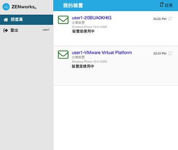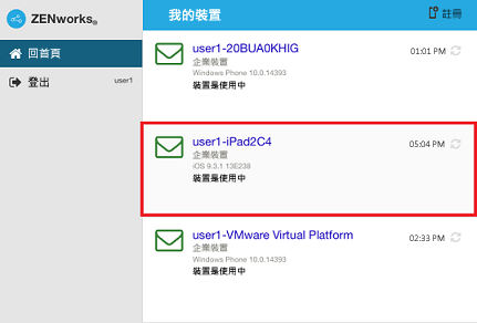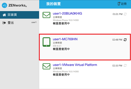 與該使用者關聯的所有裝置都會顯示在 ZENworks 使用者入口網站中。