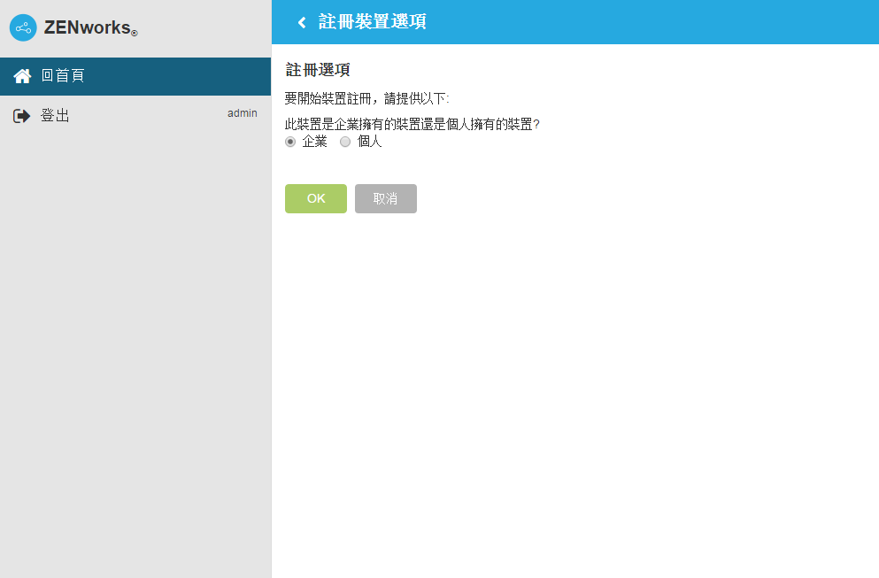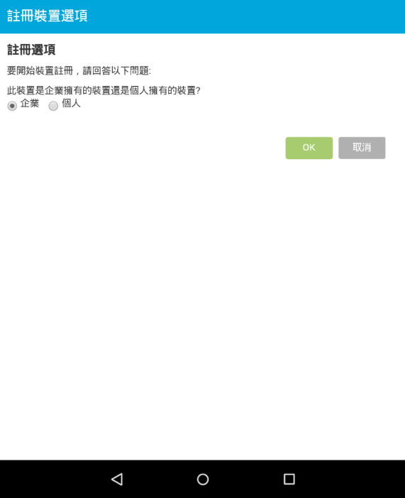 如果已將行動裝置註冊規則設定為允許使用者指定裝置擁有權 (企業或個人),系統會提示您輸入該資訊。在裝置上提供所需的註冊資訊,然後點選確定。