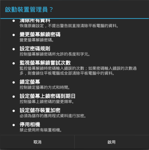 按一下啟用此裝置管理員,以允許您透過執行此螢幕中列出的操作來管理裝置。