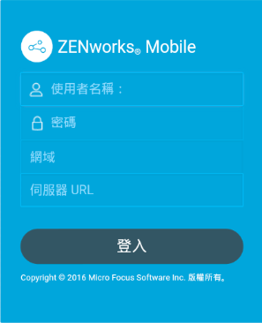 ZENworks 代理程式 APP 登入螢幕即會顯示。