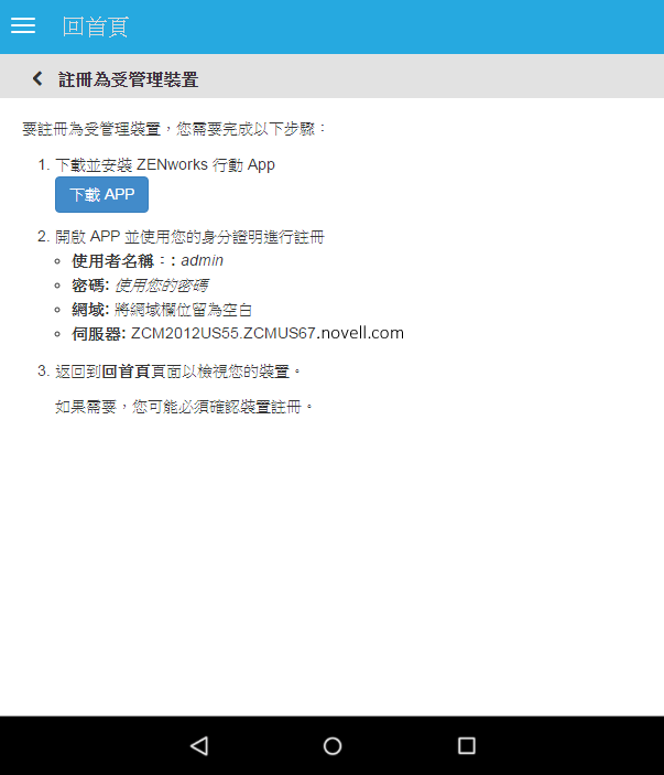 使用者名稱、密碼、網域、伺服器 URL︰ 使用您最初登入 ZENworks 使用者入口網站時所用的使用者名稱、密碼和註冊網域 (必要時),以及 ZENworks MDM 伺服器的伺服器 URL。您可以從 ZENworks 使用者入口網站獲取此資訊,如步驟 4 中所述。