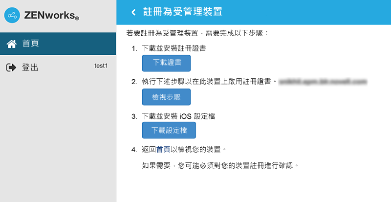 此處介紹如何將一部 iOS 裝置註冊為 ZENworks 管理區域中的完全受管理裝置。