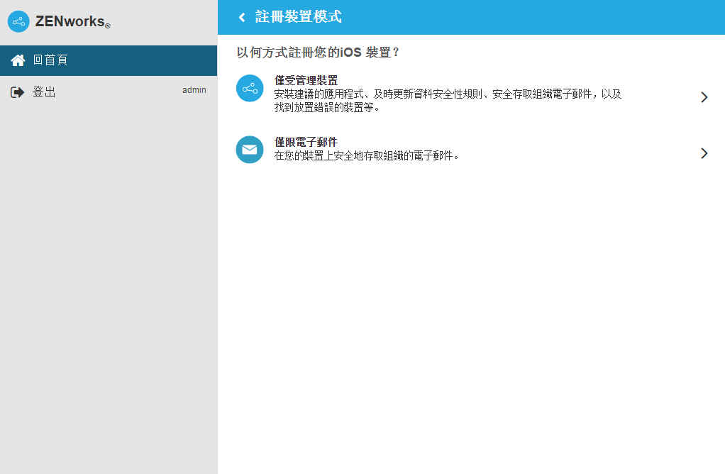 此處介紹如何將一部裝置註冊為 ZENworks 管理區域中的僅限電子郵件裝置。其中詳細介紹了將 iOS 裝置註冊為僅限電子郵件裝置的程序。