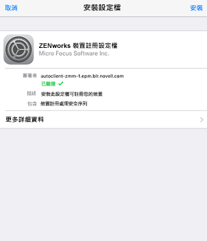 ZENworks 裝置註冊設定檔包含 ZENworks 管理裝置所需的 MDM 設定檔。